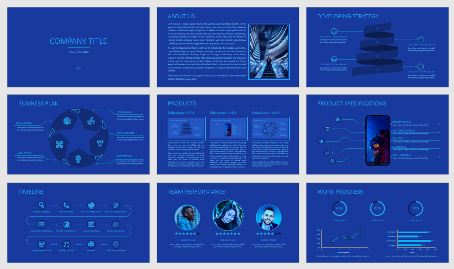 A professional PowerPoint template featuring a custom mobile mockup, business strategy diagrams, product versions, team performance, and project timelines. Ideal for startups, product launches, and corporate presentations.