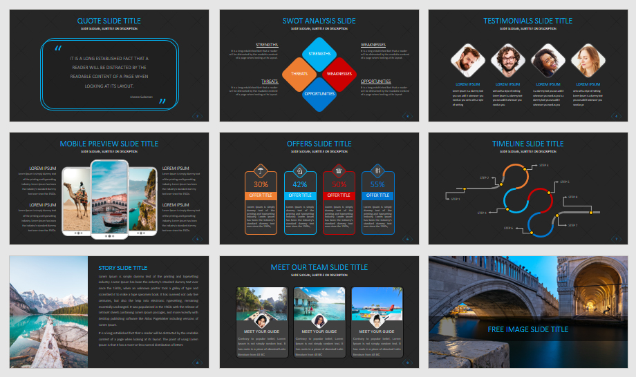 A striking dark-themed PowerPoint template featuring quote slides, SWOT analysis, testimonials, mobile previews, offers, timelines, and scenic visuals. Ideal for tech, startups, and creative business presentations.
