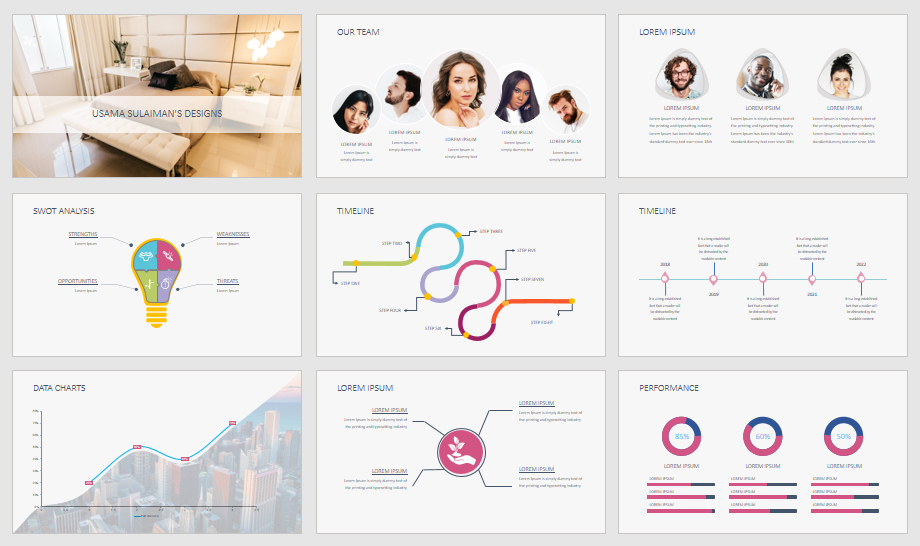 A sleek and professional PowerPoint template featuring team profiles, SWOT analysis, timelines, data charts, and performance metrics. Ideal for business presentations, portfolios, and project proposals.